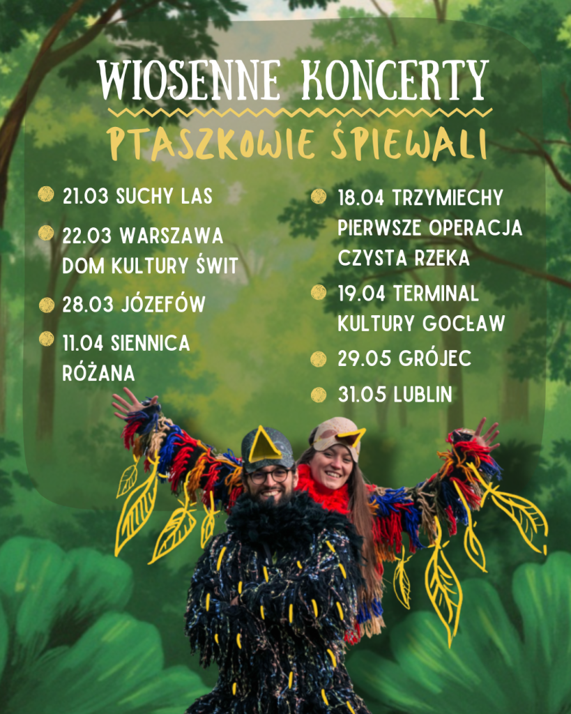 W programie koncertowym prezentujemy autorskie piosenki, które opowiadają o przyrodzie, ptakach, ssakach, owadach, roślinach, żywiołach, ekologii. Odnosimy się do rzetelnej wiedzy i nauki, oraz promujemy ekologiczny styl życia w zgodzie z naturą.